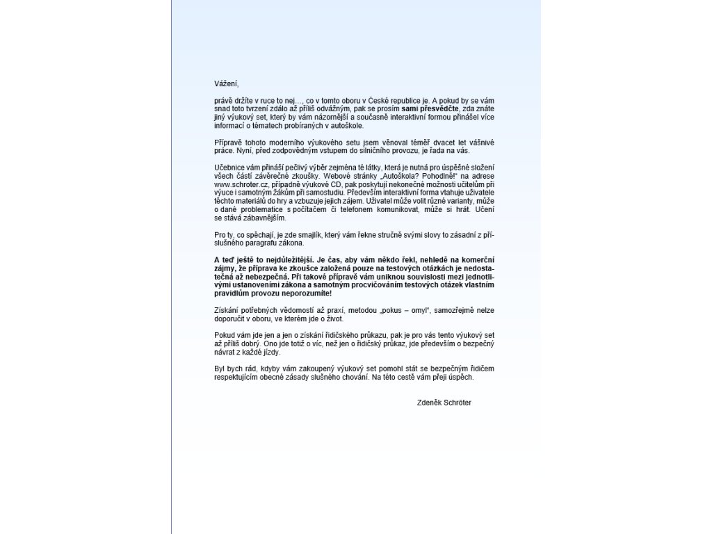 Už více než 560 000 čtenářů si vybralo právě tuto učebnici pro její názornost, velké množství fotografií a obrázků, i pro její celkovou kreativitu. Komiksovým způsobem vedený výklad látky se cíleně vztahuje vždy ke konkrétnímu vozidlu, řidiči, dopravní značce apod. Pro ty, co spěchají je zde smajlík, který vám řekne to nejdůležitější z příslušného paragrafu svými slovy.